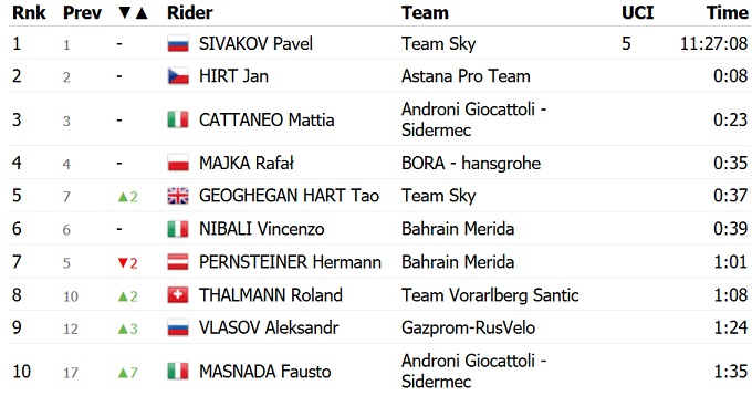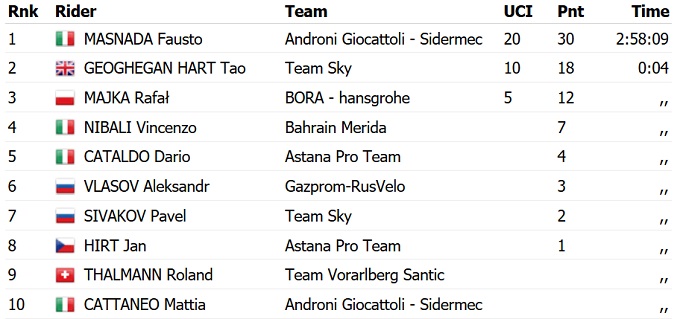 Итальянский велогонщик Фаусто Маснада стал победителем третьего этапа Тура Альп, опередив Тао Геогегана Харта и Рафала Майку. Лидерство в общем зачете сохранил победитель вчерашнего второго этапа Павел Сиваков.
