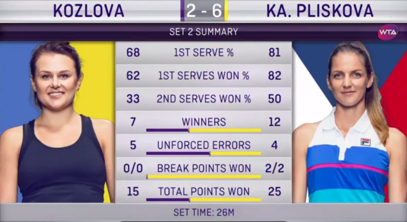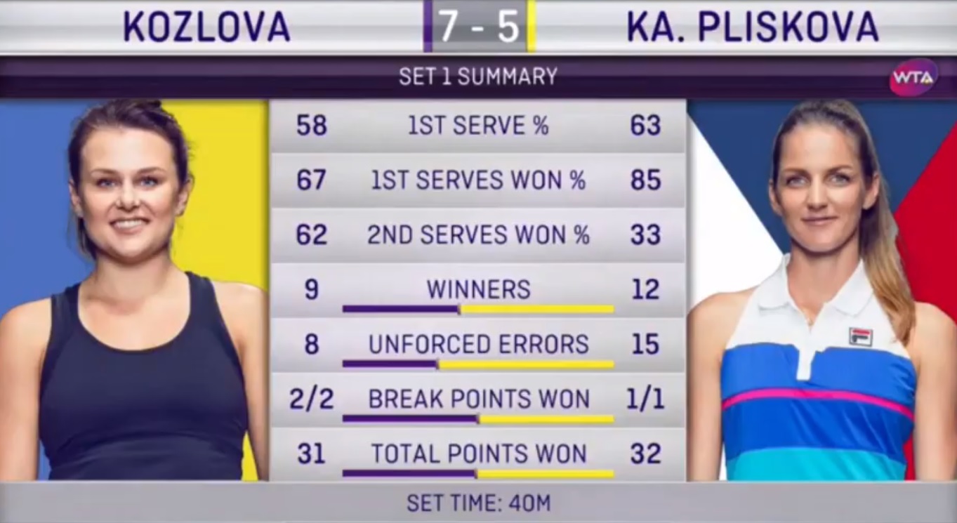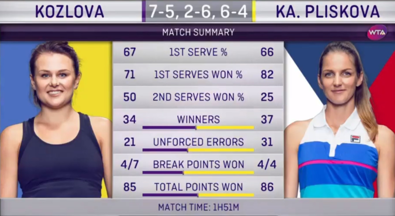 С первого же сета Катя показала теннис высочайшего уровня. План на игру был понятен: глубокие приемы, активная игра и выматывание соперницы сменой ритма. И самое главное, что это получалось на протяжении всего матча. Даже в проигранном втором сете Козлова не выглядела слабо, так уже получилось, что Плишкова может на некоторое время включить «God Mode» и выиграть сет у любой противницы. Но грамотная игра в первых партиях сделала результат в третьем сете, когда из-за усталости Плишкова уже смотрелась намного слабее.