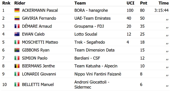 Победителем пятого этапа Джиро-2019 стал немецкий гонщик Паскаль Аккерманн из Bora Hansgrohe. В финишном спринте он опередил Фернандо Гавирию и Арно Демара.