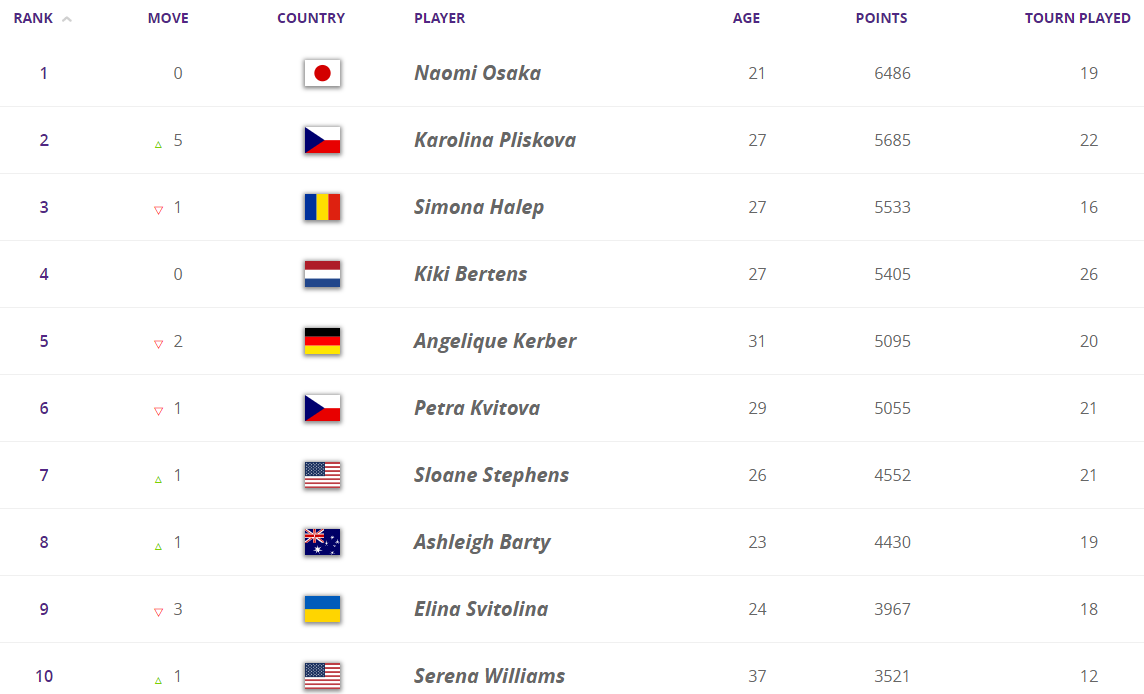 Наоми Осака осталась первой, на вторую позицию поднялась Каролина Плишкова