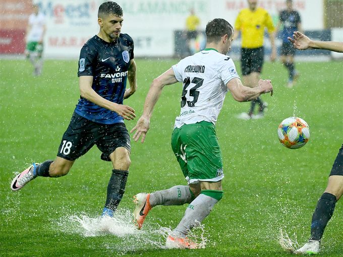 Во втором тайме матча «Карпаты» - «Десна» пришлось играть в непростых погодных условиях, под проливным дождем. Под конец игры поле стадиона «Украина» напоминало арену для водного поло.