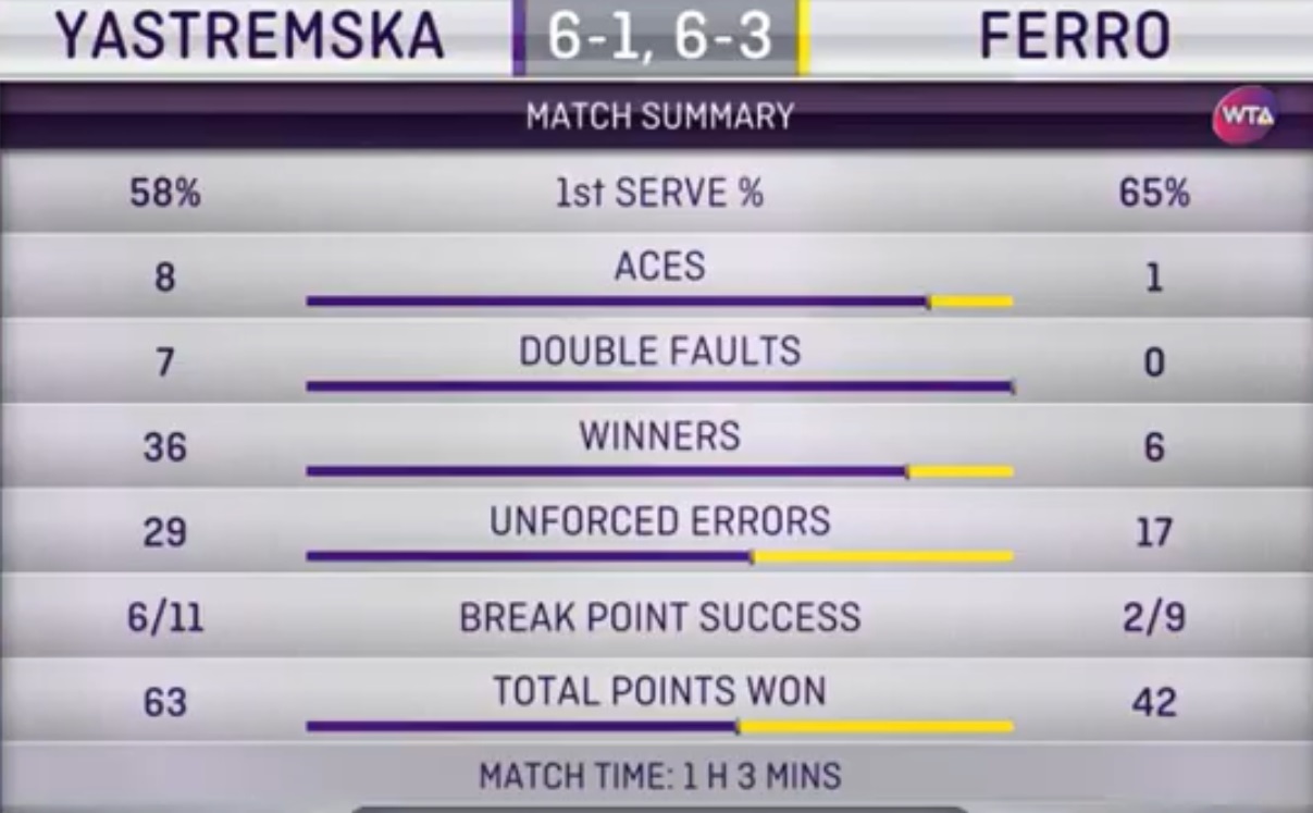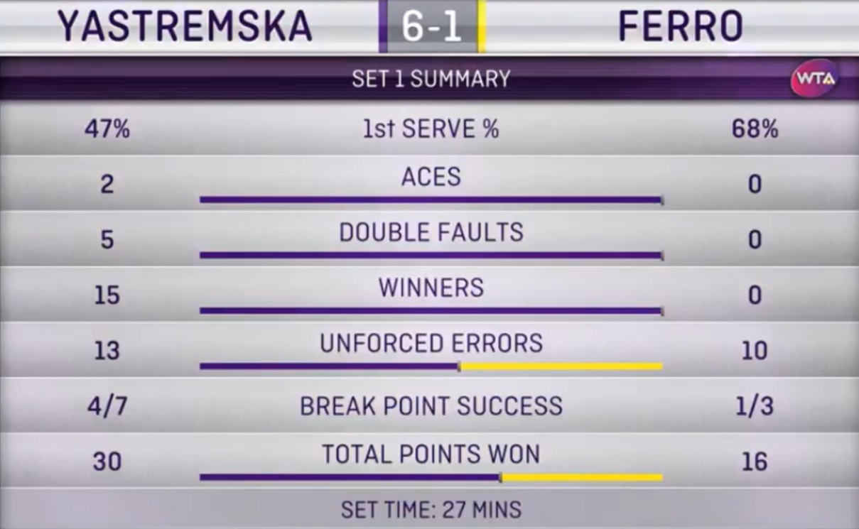 Ястремская продолжает в Страсбурге «тренироваться на кошках», очередной тотальный вынос соперницы состоялся и в четвертьфинале. Единственное очко Ферро сумела заработать в первом сете только после трех двойных на подаче украинки. Все остальное время на корте была только одна теннисистка и делала она абсолютно все, что хотела.
