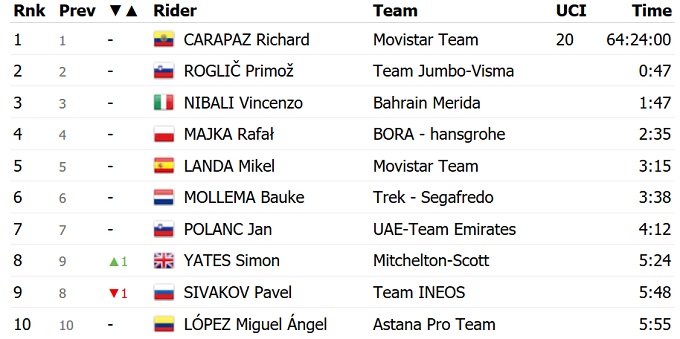Пользуясь тактическими играми Нибали и Роглича, Ричард Карапас перехватил лидерство в общем зачете еще в субботу после победного этапа до Курамйора, однако тогда его преимущество над Рогличем составляло скромные 7 секунд, которые словенец с легкостью отыграл бы на финальной разделке в Вероне. Тем не менее, для Роглича была создана ситуация, в которой он теперь должен отвечать не только на атаки Нибали.