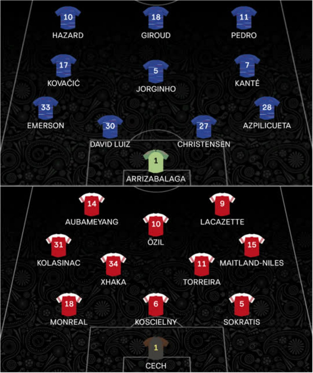 «Челси»: Кепа Аррисабалага, Сезар Аспиликуэта, Андреас Кристенсен, Давид Луис, Эмерсон, Н'Голо Канте, Жоржиньо, Матео Ковачич (Росс Баркли, 76), Эден Азар (Давиде Дзаппакоста, 89), Оливье Жиру, Педро (Виллиан, 71).