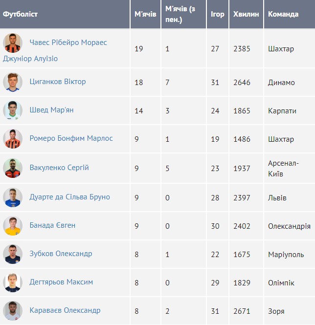 Второе место в списке лучших бомбардиров сезона занял капитан «Динамо» Виктор Цыганков (18 голов в 31 матче, 7 из них – с пенальти). На третьем месте разместился Марьян Швед из львовских «Карпат» (14 мячей в 24 матчах, 3 из них – с пенальти).