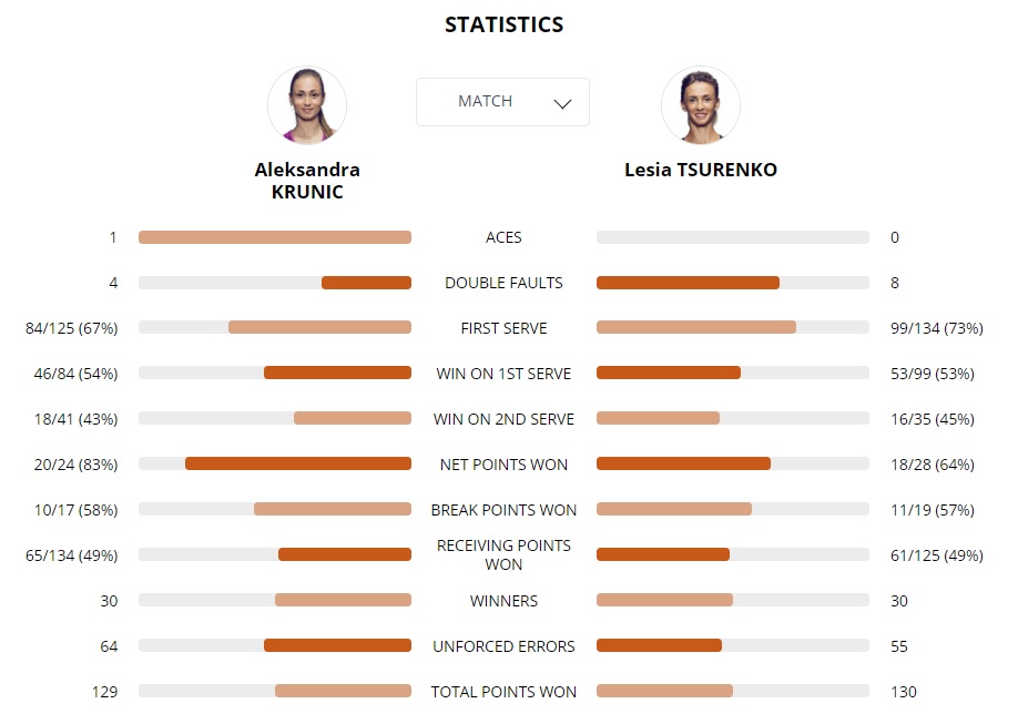В доигровке матча против Александры Крунич из Сербии (№76 WTA) Леся выиграла на два гейма больше, что и принесло ей победу. Напомним, в четверг поединок был приостановлен при счете 6:6 в третьей партии (на Ролан Гаррос третий сет играется без тай-брейка, до разницы в два гейма).
