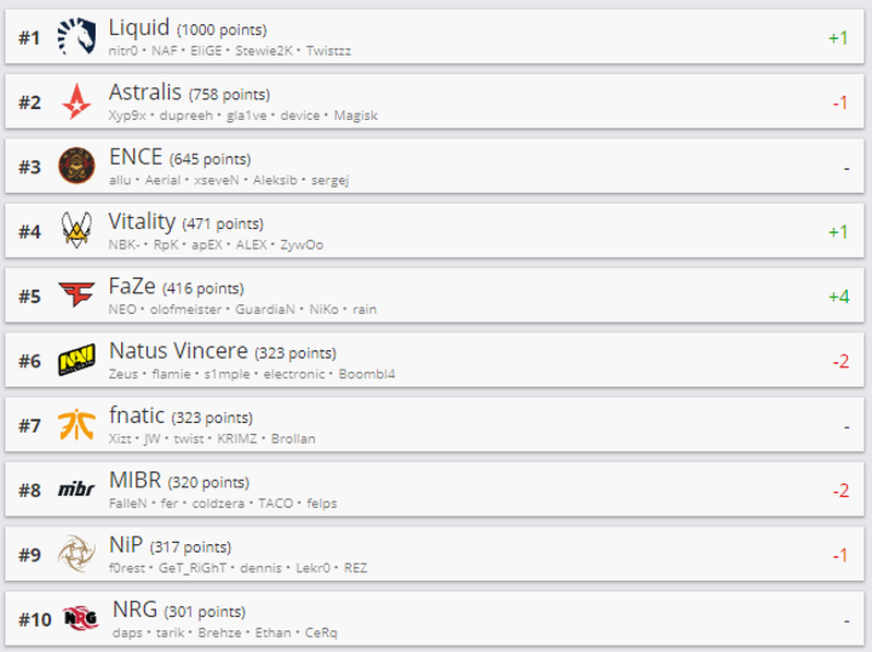 Отметим, что Astralis покинули первую строчку рейтинга впервые с 23 апреля 2018 года. Третье место удерживает ENCE.