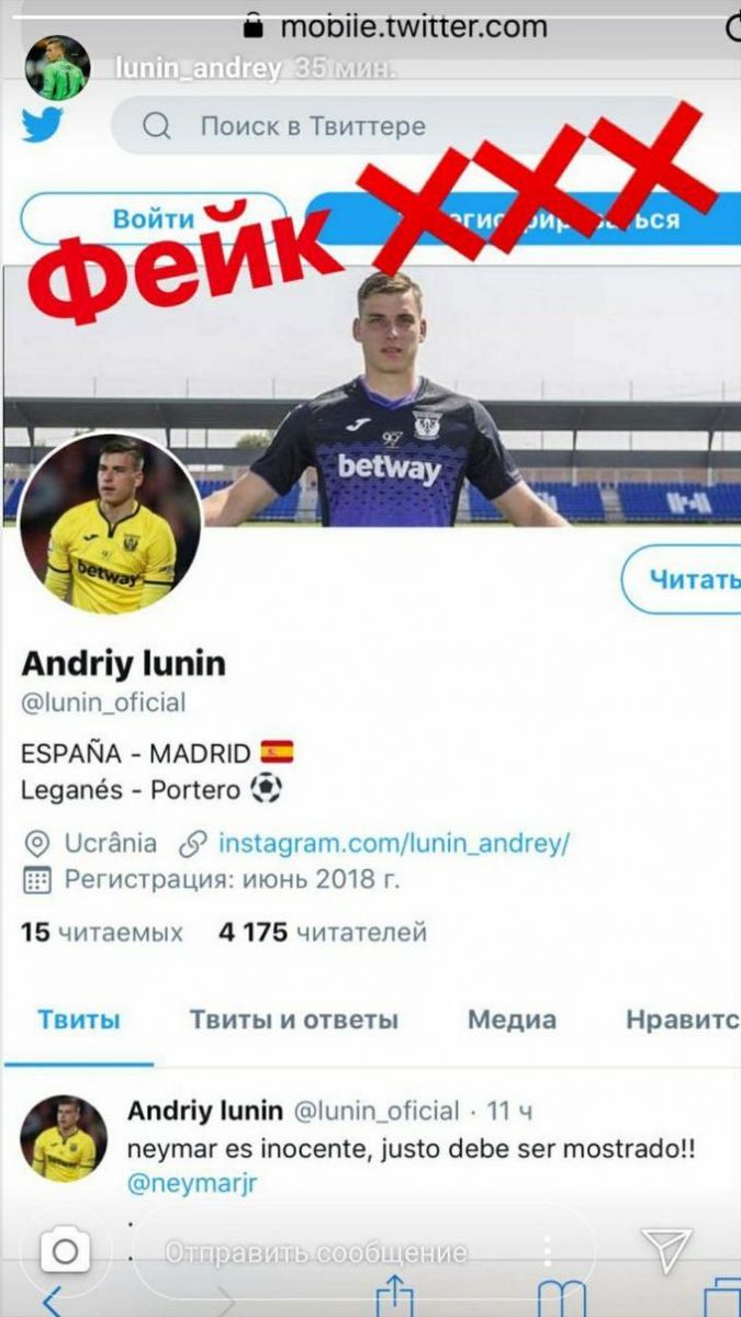 «Фейк», — лаконично прокомментировал Лунин твит про Неймара в своем Instagram.
