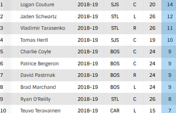У игрока 14 заброшенных шайб. Топ-5 замыкают Джейден Швартц (12), Владимир Тарасенко (11), Томаш Хертл (10) и Брэд Маршан (9).