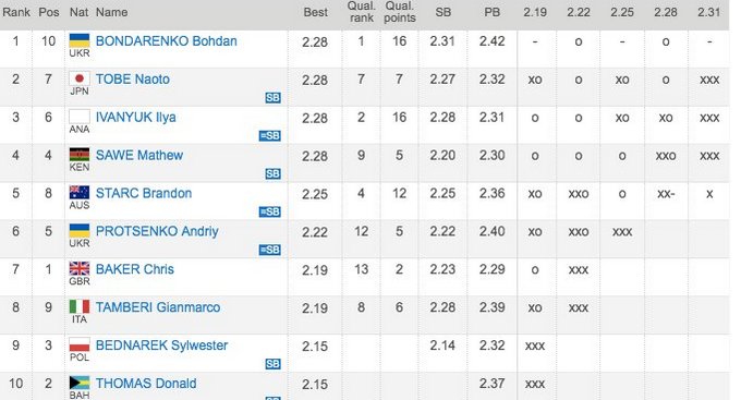 Бондаренко победил с результатом 2,28 м. Бондаренко опередил японца Наото Тобе и россиянина Илью Иванюка.