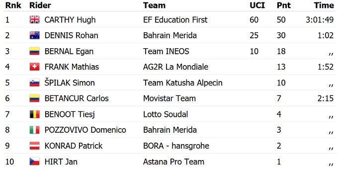 Последний, 9-й этап многодневки Тур Швейцарии-2019 выиграл британец Хью Карти из Education First. Победу в общем зачете одержал колумбиец Эган Берналь из Ineos, который на 19 секунд опередил австралийца Роана Денниса из Bahrain Merida.