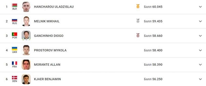 Украинец Николай Просторов финишировал четвертым в прыжках на батуте на Европейских играх-2019 в Минске. Украинец набрал 58,400 балла и уступил только белорусу Владиславу Гончарову, россиянину Михаилу Мельнику и португальцу Диогу Ганшинью.