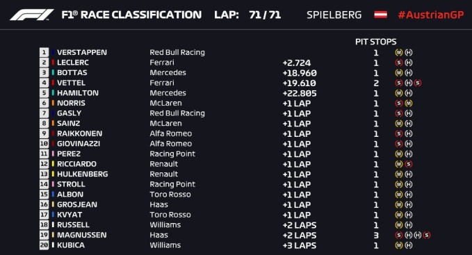 Расклады перед стартом гонки в Австрии были интересные. Борьба за лидерство между Шарлем Леклером и Максом Ферстаппеном, а также наседающий сзади Льюис Хэмилтон. Британец, получивший штраф в минус 3 позиции, стартовал не 5-м, а 4-м из-за штрафа Кевина Магнуссена. И, конечно, прорывающийся с 9-го места Себастьян Феттель.