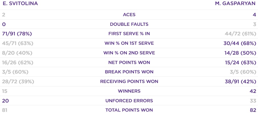 В первом сете у Гаспарян отменно работали удары слева, одноручный бэкхенд давал сбои лишь тогда, когда Свитолина забегала под обратный кросс, чтобы максимально сильно пробить форхендом с левой части корта. К сожаления, случалось это довольно редко. Еще одной неожиданностью от Элины стали постоянные выходы к сетке, поначалу она старалась рвать темп, хотя это и не всегда приносило плоды. Маргарита приняла этот вызов, что в последствии также могло повлиять на возникновение ее повреждения.