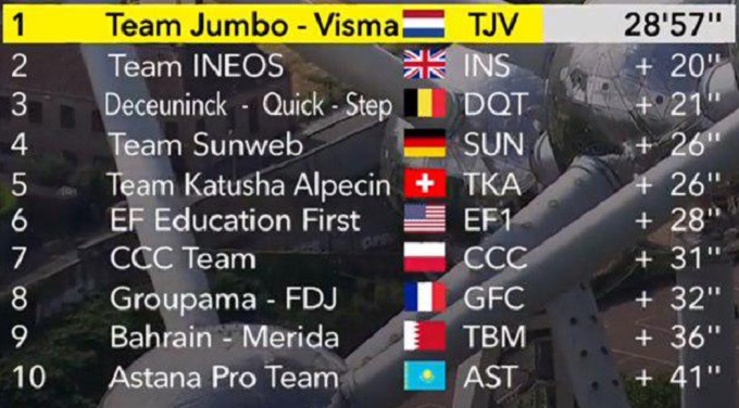 Голландская команда Jumbo Visma стала победителем командной разделки на 27 км в Брюсселе на втором этапе Тур де Франс-2019. Лидером общего зачета остался победитель первого этапа Мике Тойниссен, также представляющий Jumbo Visma.