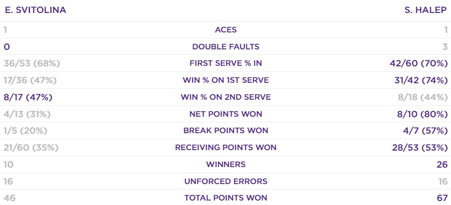 Второй сет проходил в другом ключе, но тенденция близости поражения сохранялась. В первых шести геймах теннисистки защитили свои подачи, при этом Элина не взяла ни одного очка на приеме, а свой последний гейм выиграла с трудом. Далее Халеп повысила передачу и сомнений в ее победе не возникало вообще. Самое обидное, что она переиграла Свитолину абсолютно по всем показателям. Даже у сетки, где на протяжении турнира Элина выглядела весьма неплохо, сегодня была деклассация.