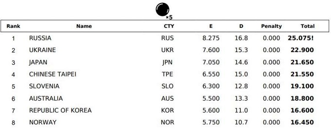 Анастасия Возняк, Валерия Ханина, Елена Дьяченко, Виктория Фотеева и Дарья Мурай стали вторым в упражнении с пятью мячами. Украинки набрали 22,900 балла и уступили только команде России.