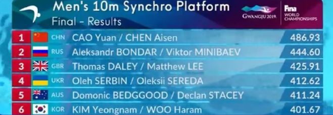 Первое место занял китайский дуэт – Чао Ян/Чен Айсен. Вторым стал российский дуэт Бондар/Минибаев, третье место завоевали британцы Дейли/Ли.