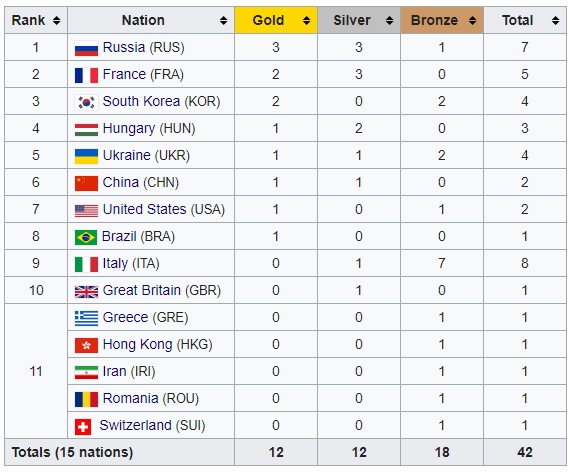Выше украинцев в медальном зачете расположились сборные России, Франции, Южной Кореи и Венгрии.