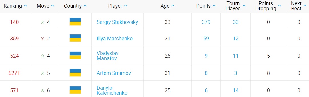 Что касается украинцев, то Сергей Стаховский поднялся на 4 места. Также по несколько позиций добавили Владислав Манафов, Артем Смирнов и Данила Калениченко. На 2 строчки опустился Илья Марченко.