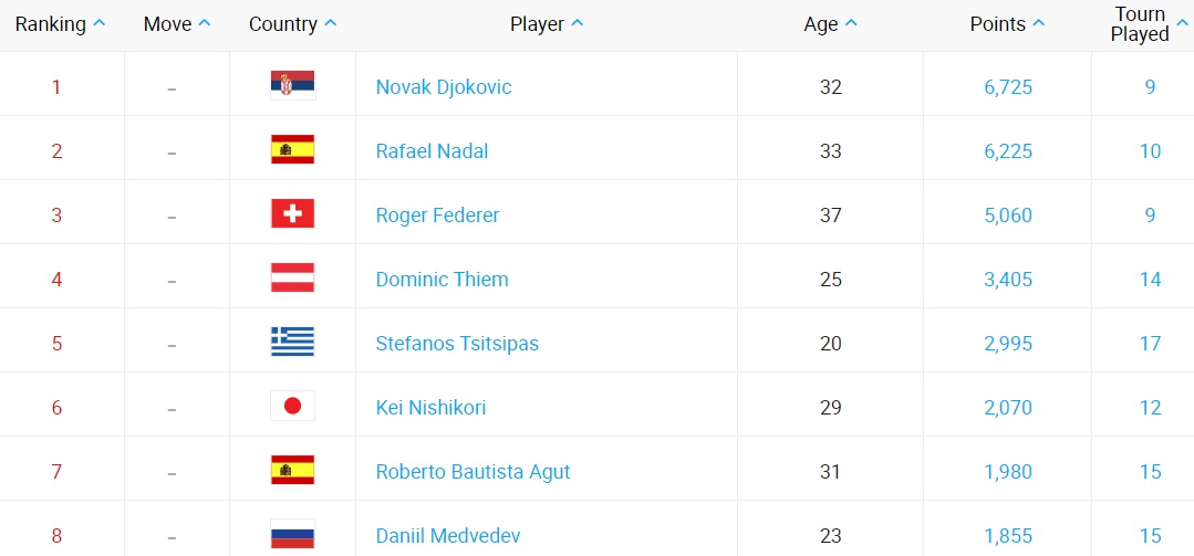 В первой десятке случилось лишь одно изменение: Даниил Медведев опередил Фабио Фоньини.