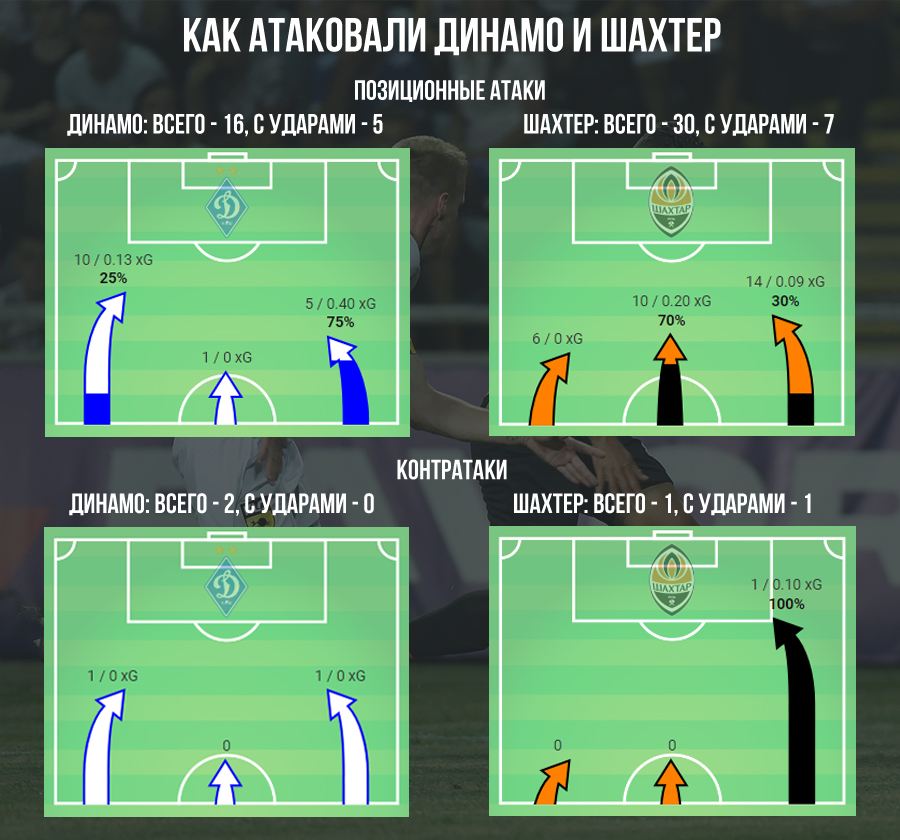 Перевес в матче во владении мячом оказался на стороне «Шахтера» (59% на 41%). «Горняки» привычно больше пасовали, существенно превзойдя соперника и в показателе «умных» передач (11 против 3, из которых точными оказались 6 и 0 соответственно). Но все это в очередной раз не принесло серьезных плодов действующему чемпиону Украины в битве с главным конкурентом. Гол, забитый в концовке первого тайма, влетел в ворота «Динамо», скорее, вопреки, чем благодаря. Неудачная позиционная игра Кадара, а также «ассист» от Беседина на Алана Патрика привели к плачевным для киевлян последствиям. Но, поведя в счете, «Шахтер», как и при Фонсеке, не стал действовать более рационально и взвешенно. Вместо того, чтобы отдать мяч «Динамо» и сыграть на контратаках, дончане во втором тайме продолжили с упоением контролировать мяч и утешать себя мнимым доминированием на поле. Давление «горняков» не приводило к ошибкам со стороны соперника (80 на 88 в пользу «Динамо» по числу потерь мяча, а также 53,3% против 42,4% также в пользу киевлян по выигранным единоборствам), а вот наименьшая оплошность в обороне «Шахтера» давала отменный шанс «бело-синим» для организации быстрых и опасных контрдействий.