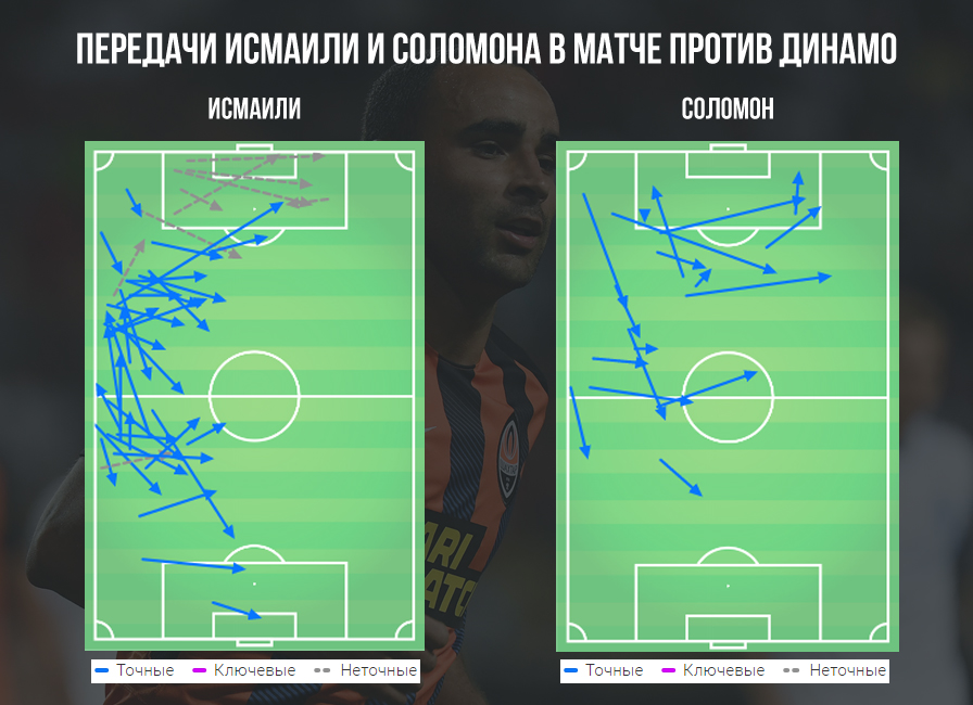 Соломон же и вовсе сыграл в лучших традициях Веллингтона Нема, который нынешним летом отбыл в аренду в родной «Флуминенсе». Прежде всего, израильтянин был малоактивен (только 34 ТТД за 69 минут при 68% их успешности), а во-вторых, действовал как-то крайне осторожно и академично. В передачах Соломона читалось явственное желание не допустить ошибку. В итоге в его активе 18 пасов при их 100% точности, однако подавляющая часть передач были направлены назад или поперек поля, а потому опасности воротам «Динамо» представлять не могли априори.