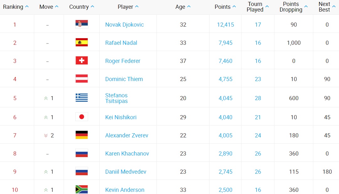 В первой десятке произошло несколько изменений: прошлогодний победитель турнира в Вашингтоне Александр Зверев потерял две позиции и пропустил вперед Стефаноса Циципаса и Кеи Нисикори, а также из топ-10 вылетел Фабио Фоньини.