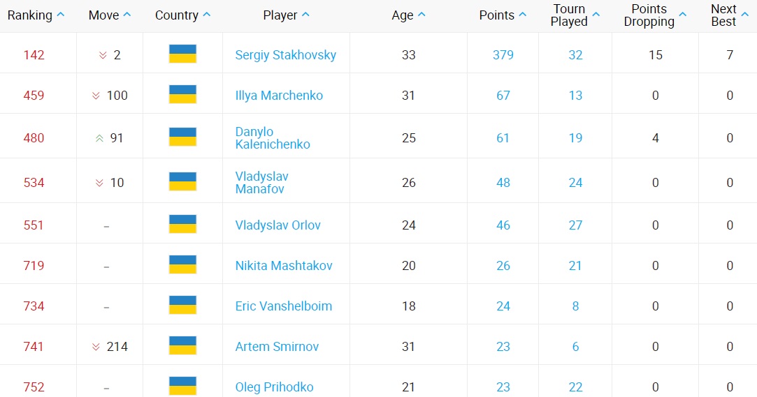 Что касается украинцев, то Илья Марченко опустился на 100 позиций, Артем Смирнов – на 214, а Данила Калениченко добавил 91 строчку, у остальных изменения не столь радикальные.