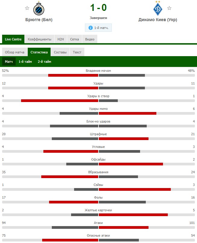 Предлагаем ознакомиться со статистикой матча от веб-портала MyScore. Обращает на себя внимание, что киевляне нанесли всего один удар в створ: Артем Беседин вышел на ударную позицию и пробивал низом на 15-й минуте, но Симон Миньоле выручил бельгийский клуб.