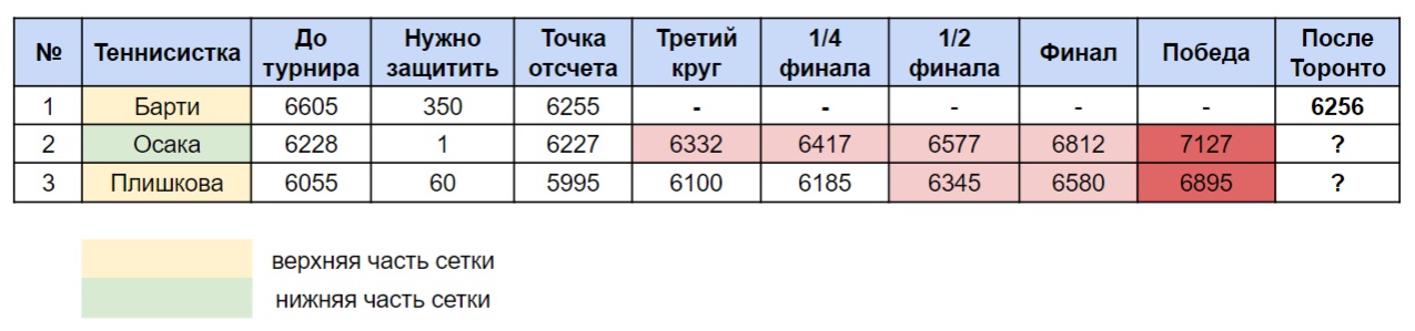 Осаке будет достаточно выиграть один матч и выступить не намного хуже Плишковой (детально можно посмотреть в таблице ниже), а вот чешке нужно выходить как минимум в полуфинал и надеяться на осечку японки.
