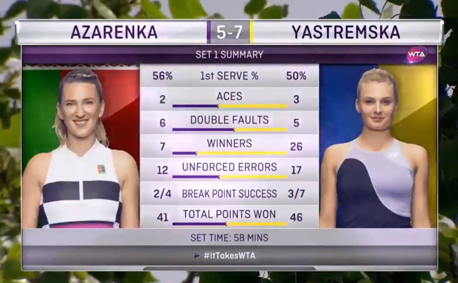 Начало матча с Азаренко отличалось от того, что мы видели в первом круге против Конты. Ястремская сразу же заиграла на высоком уровне, держала сумасшедший темп и полностью доминировала на корте. Азаренко, лучшие годы которой уже позади, просто не успевала за той скоростью, которую предложила украинка. В многих случаях представительница Беларуси даже не бежала за мячами, настолько хорошо Даяне удавалось растягивать ее по корту.