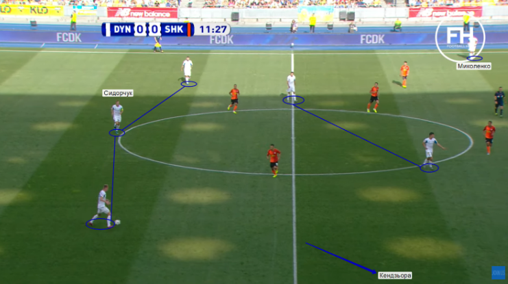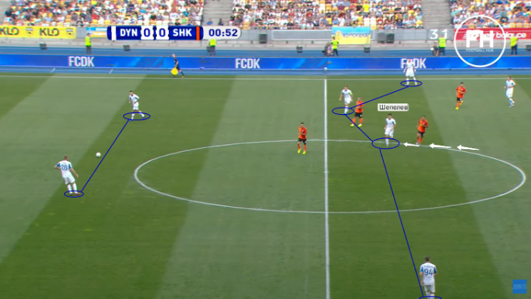4. Переходим к игре, ведь тут были некоторые изменения по сравнению с встречей за Суперкубок. В поединке в Одессе Хацкевич использовал Шепелева как игрока, который опускается в линию к центральным защитникам и исполняет функции плеймейкера. В этом матче в билд-апе было несколько схем. 2-3 (основная), 2-4 и 3-x. В основной схеме центральным полузащитником является Сергей Сидорчук. Но он не очень подходит под роль «разыгрывающего» и в «Динамо» очень часто возникали проблемы с выходом из обороны, поэтому были два варианта продолжения игры.