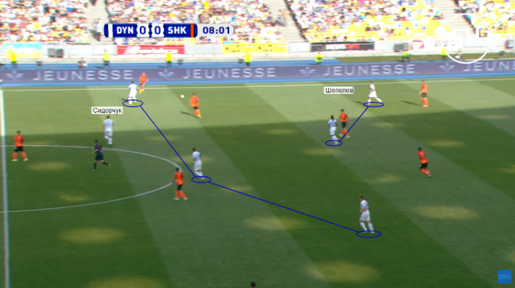 6. Переходим к игре без мяча. В этом компоненте команды также подстраивались один-к-одному. В Одессе «Динамо» играло в простые 4-4-2. Вчера же мы увидели некий гибрид 4-5-1, 4-1-4-1 и 4-4-2. Если роль второго нападающего в матче за Суперкубок играл Гармаш, то вчера эту роль исполнял Шепелев. Он сделал очень много работы в прессинге и был очень полезен без мяча. Я думаю, что именно из-за этого он не был оттянутым плеймейкером. На позиции форварда вышел новичок Жерсон Родригеш, который более мобилен и быстр, чем Беседин. Он преимущественно контролировал центр и прессинговал игрока, который ближе всего к нему. Шепелев же больше бегал в зоны, где соперник контролировал мяч. Во многих случаях Сидорчук располагался ниже всей линии полузащитников, таким образом страхуя опорную зону.
