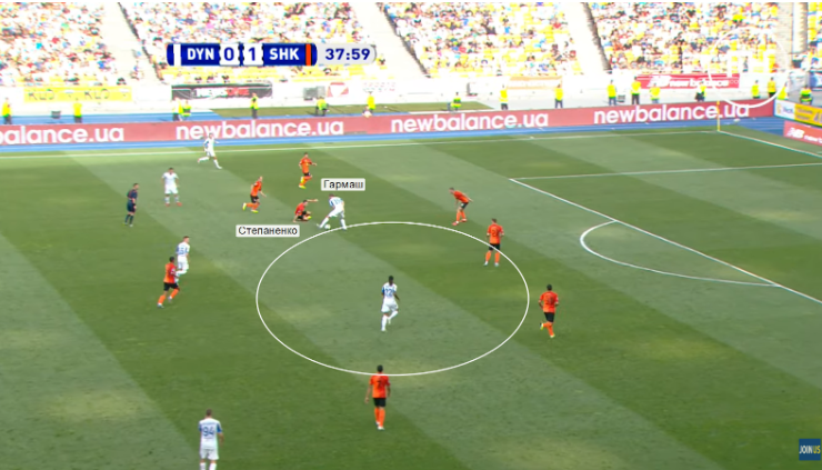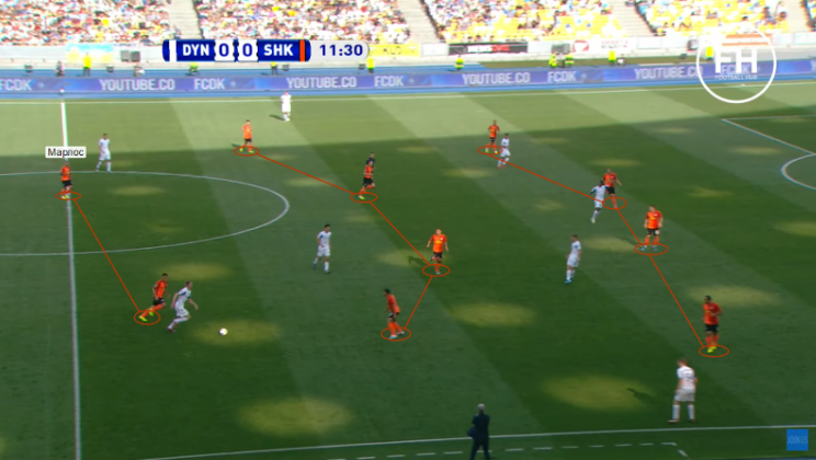 «Динамо» не позволяли себе бросить зоны и начать прессинговать соперника, только тогда когда, игроки «Шахтера» заходили достаточно далеко. То есть, защитник без сопротивления начинает бежать в свободную зону, но туда часто смещался Марлос. Это смещение заставляет игрока отдать короткий пас на бразильского украинца. И в некоторых эпизодах это убивало темп атаки.