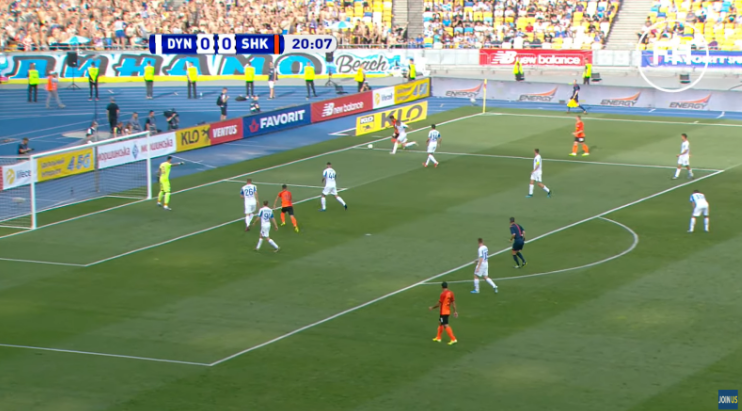 7. Сразу сделаем оговорку, что гол был забит справедливо. И апелляции Бурды и де Пены не несли никакого смысла. На скриншоте видно, что в штрафной у «Динамо» против Мораеса сразу 3 игрока, и перекрыть его не должно было бы стать проблемой. Два центрбека - Бурда и Кадар играют «по мячу» и это скорее ошибка тренерского штаба. Ведь, в таких ситуациях должен хоть кто-то один опекать форварда. Но центральные защитники обращены спиной к Мораесу и просто не видят его вбегания во вратарскую. Также хотелось бы отметить не только замыкание Мораеса, которое было идеальным и по решению, и по исполнению, пас и прорыв Соломона, но и еще крутую игру Болбата. Немногие заметили, но его роль в этом голе не малая. При контроле мяча на правом фланге именно он отдает опасную передачу, отрезая двух соперников. Потом он вбегает в штрафную, но не открывается, а останавливается и «привлекает внимание» де Пены, который уже не может страховать Миколенко, а должен опекать Болбата.