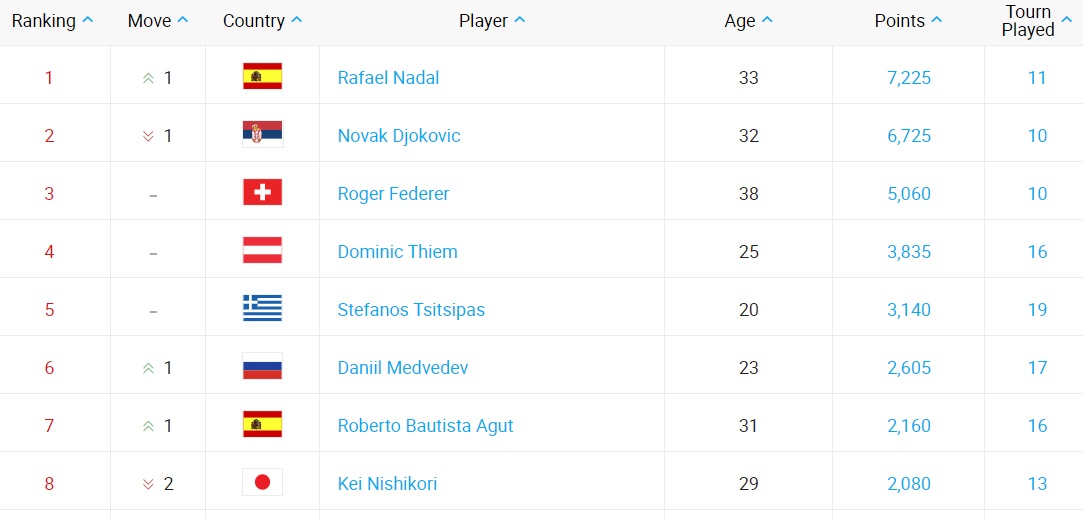 Рафа сохранил второе место в мировой классификации, а в первой десятке состоялись несколько изменений. Финалист Монреаля Даниил Медведев обошел своего соотечественника Карена Хачанова и стал первой ракеткой России. Стефанос Циципас потерял две позиции, пропустив вперед Кеи Нисикори и Александра Зверева. Кевин Андерсон вылетел из топ-10, его место занял Фабио Фоньини.