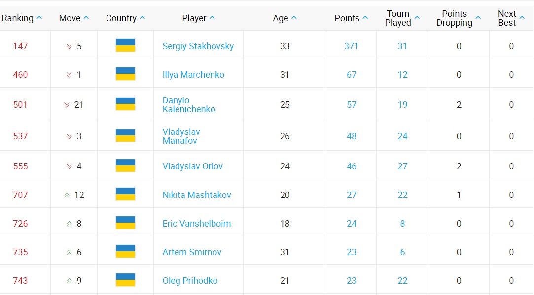 Украинцы в топ-750 рейтинга ATP