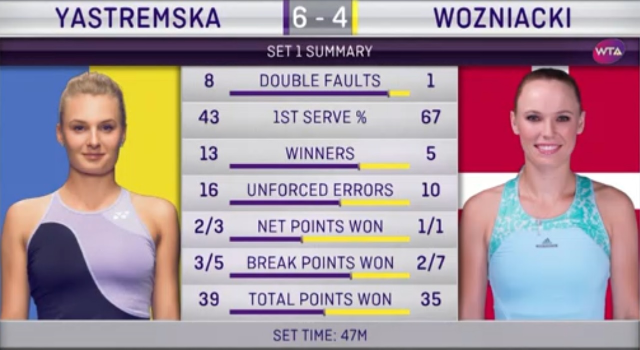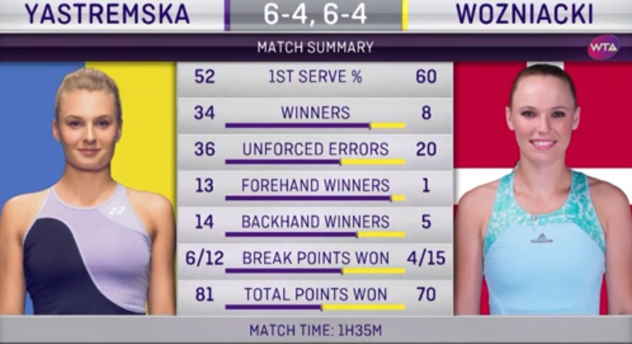 Чем-то этот матч напомнил встречу Даяны с еще одной экс-первой ракеткой в Торонто. Но больше по сюжету, чем по содержанию. Возняцки, которая в последнее время уже не показывает результатов топ-уровня по понятным причинам, сегодня была явно слабее Ястремской. Но и у украинки был не лучший день. Даяна много ошибалась, подача была хуже среднего, а количество невынужденных также было великовато.