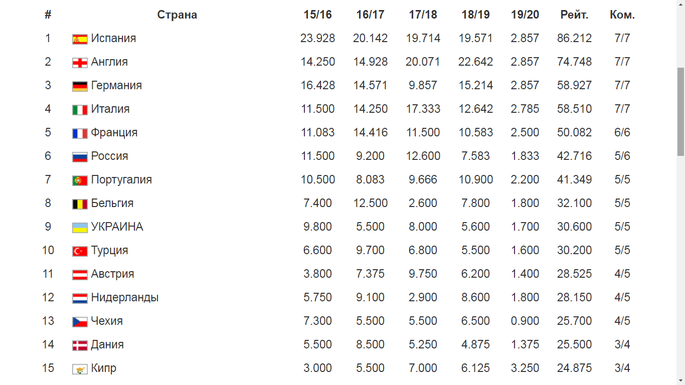 Таблица коэффициентов УЕФА. Турция вплотную приблизилась к Украине