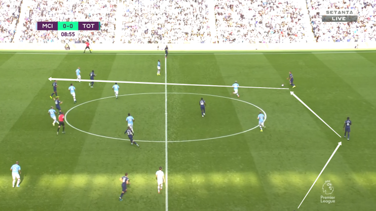 У игроков «Тоттенхэма» очень мало вариантов для короткого розыгрыша мяча. Обычно подопечные Почеттино или выбывали в надежде, что Кейн зацепится, или отдавали назад, прижимались к своим воротам и в результате своим прессингом «Сити» заставлял се равно выбивать мяч.
