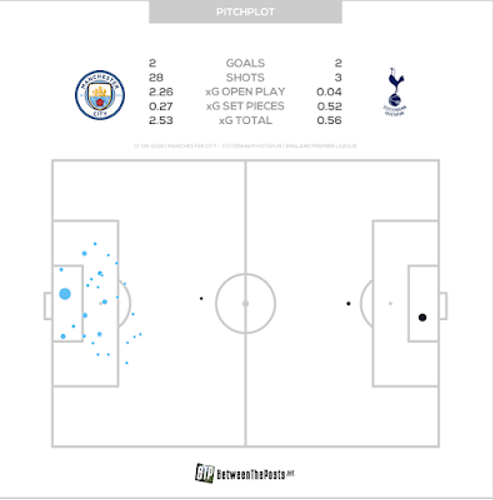 2. «Манчестер Сити» вчера уничтожил соперника. Это подтверждают и объективные показатели, и субъективные ощущения от матча. По ударам у подопечных Гвардиолы преимущество в 10 раз (30:3), территорию также выиграли «горожане» (49% действий на трети поля «Тоттенхэма» и 40% в средней). По xG также нереальное преимущество (2,53:0,56). Да, по цифрам все не аж так разгромно, но если чуть углубится, то можно лучше понять уровень везения гостей.