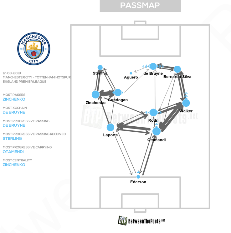 Без мяча «Тоттенхэм» закрыл центр поля, там располагалось 5 игроков, но это не помогло им перекрыть атаки соперников. Акцент атак «Сити» сместился на фланги (только 21% атак через центр), что видно по карте передача. Они располагались в 4-2-3-1.