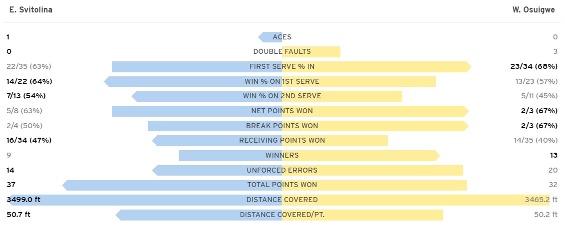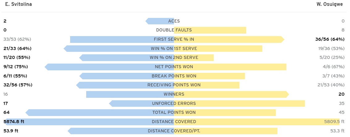 После почти «Шахтера» с «Мариуполем» в первом сете нас ожидал совсем другой рисунок матча во втором. Осигве раскрепостилась, начала лучше отрабатывать на задней линии, и перманентно давить на Свитолину. У американки начало получаться выигрывать очки со второй подачи (в первой партии было 0 из 8), это позволило набрать дополнительные очки на своих геймах и наконец-то защищать подачи. Более того, американка первой сделала брейк в пятом гейме, воспользовавшись расслабленностью Элины.