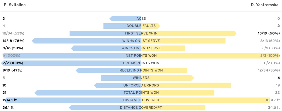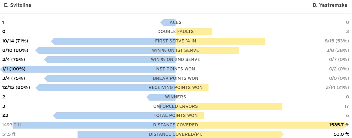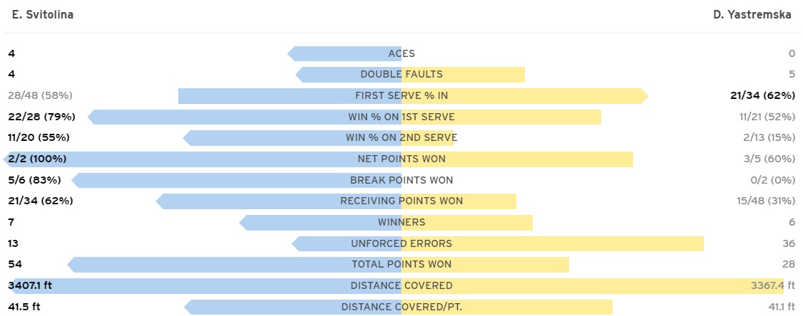 Свитолина играла разнообразно и мощно, прием подач был глубоким, а уровень тенниса во время ключевых розыгрышей был на высоте. Всего один раз игра пятой ракетки мира дала сбой, когда за гейм было допущено две двойные ошибки, но это все равно не помешало взять очко. Даяна начала хоть как-то цепляться за результат только после 0:4 в первом сете, но от поражения в партии ей было не уйти.