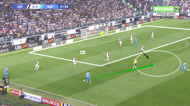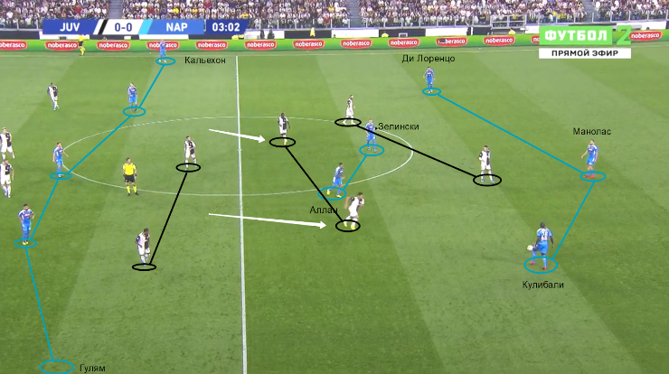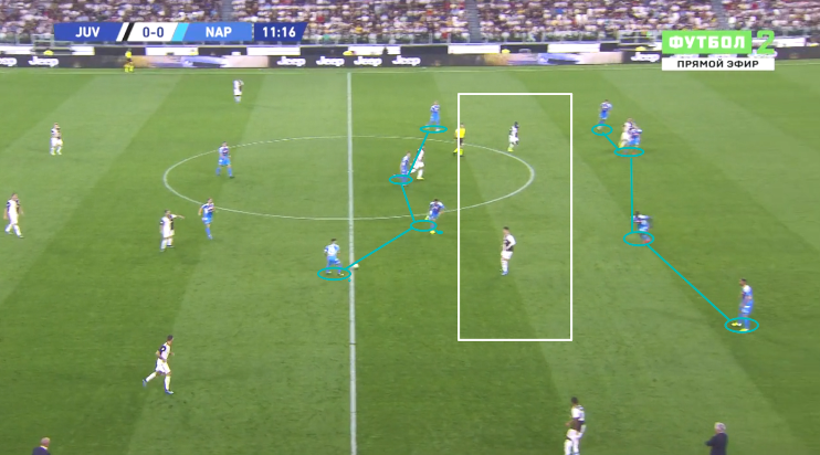 Если ди Лоренцо делает все правильно и занимает свою позицию правого защитника, то Кальехон и его партнер находятся там абсолютно бесполезно. Испанец в это время, как правый атакующий полузащитник, может подняться выше и шире, чем он отвлек бы внимание игрока «Юве» и возможность смещение Фабиану Руису. А Зелинский в это время должен пытаться получить мяч и развить атаку, но он стоит очень далеко от мяча. Можно было бы предъявить Мертенсу, так как он был ближе к той зоне, но он делает все абсолютно правильно. Бельгиец за счет скорости успевает и открыться во фланг для передачи, и забирает за собой игрока из центральной зоны.