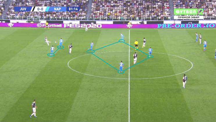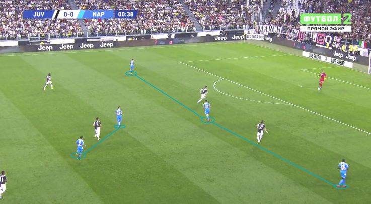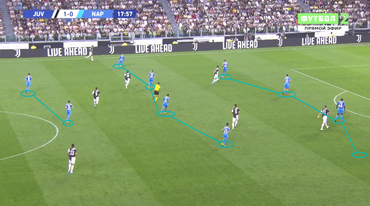 Игра в обороне была одним из слабых мест «Наполи» в этом матче. Во многих случаях они численно проигрывали в очень важных зонах. Также в некоторых моментах возникали разрывы между линиями защиты и полузащиты, куда и смещались игроки «Юве».