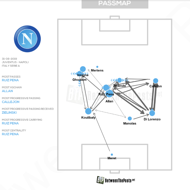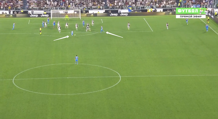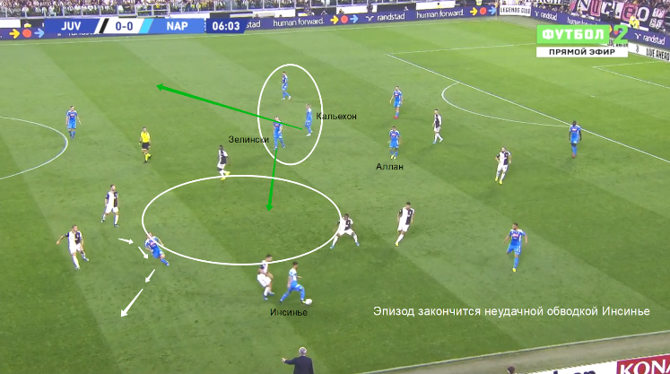 В этом эпизоде Инсинье принимает передачу спиной к воротам и следующим ходом в развитие атаки должна стать или стеночка, или пас назад. Но игроки «Ювентуса» перекрывают вариант передачи на Гуляма, но в это время появляется пространство где можно открыться для стеночки и, судя по позиции, такое забегание должен был сделать один из опорников, Аллан или Зелински. Позицию Аллан выбрал правильно, он взял под свой контроль опорную зону. В это время Зелински находится в зоне, где и так есть 3 игрока.