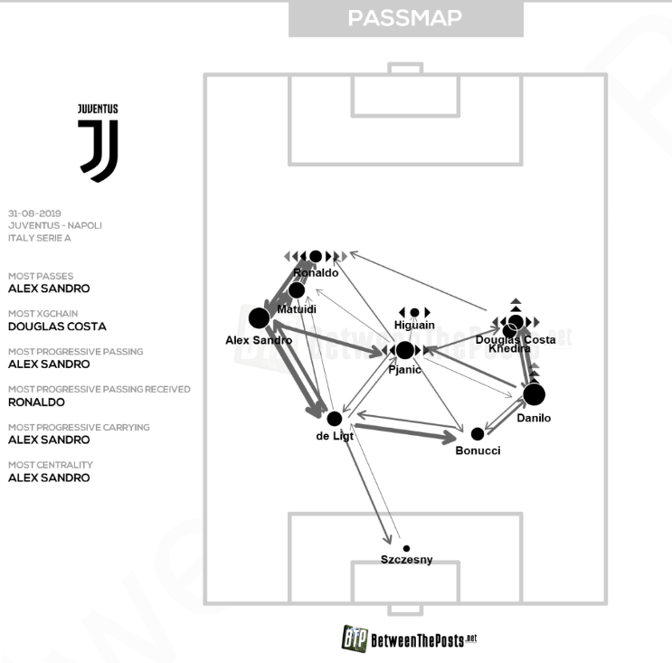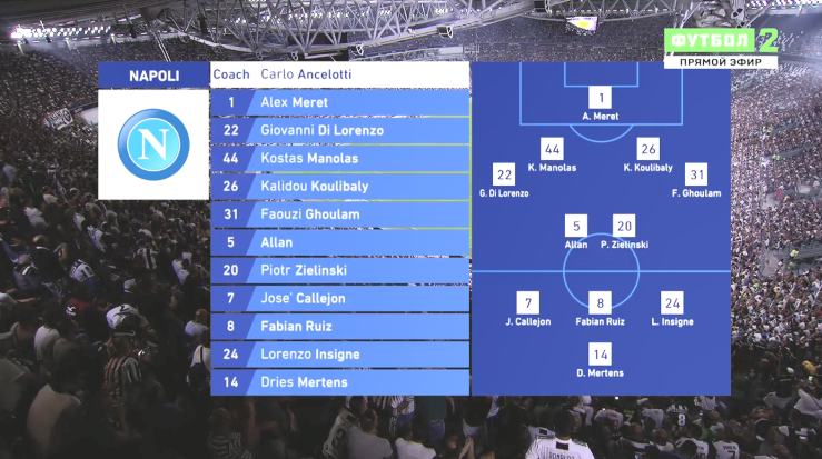 1. Оба тренера не имели много травмированных футболистов и выставили практически оптимальные составы. За день перед игрой у «Ювентуса» травмировался лидер не только на поле, а еще и в раздевалке - Кьеллини. Также матч пропускали уже давно травмированный Перин, новичок Рэмзи и молодой Марко Пьяца. Удивило, что в старте Сарри выпустил сразу двоих более оборонительных игроков. В запасе остались Рабьо, Джан и Бентакур, но Матюиди и Хедира сыграли важную роль в победе. Также слабым местом является позиция правого защитника, в этом матче в старте вышел де Шильо, а Данило вышел на замену. Именно эти два звездных игрока будут конкурировать за игровое время и явного фаворита я пока не вижу в этой паре.