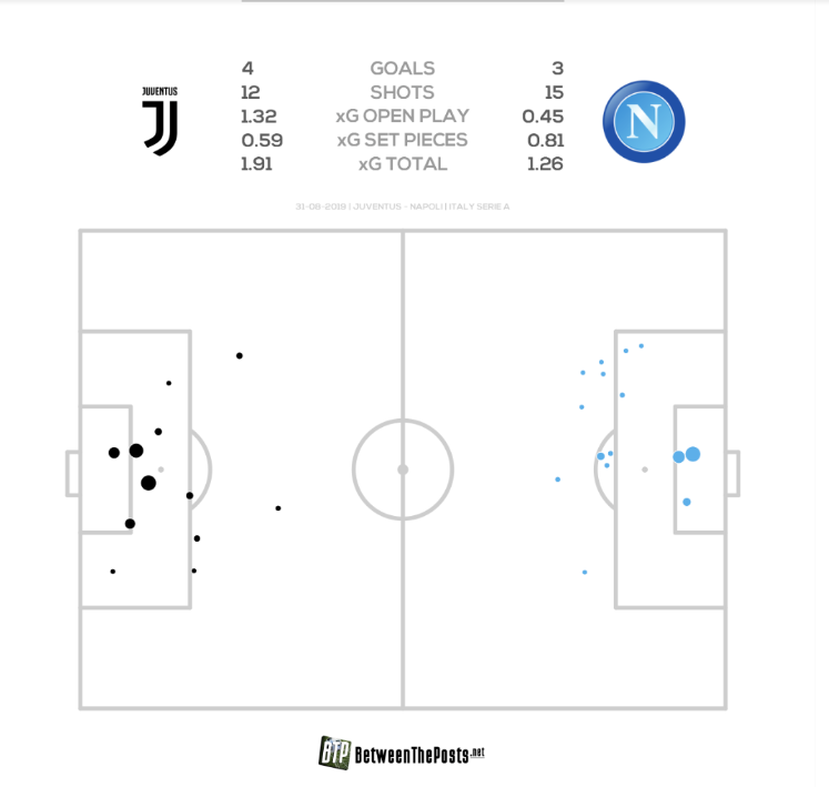 Такой темп был в первые 15-20 минут. За это время «Юве» успел забить два гола и изменить ход матча. Если в первые 20 минут «Ювентус» прессинговал на чужой половине поля, то после 2:0, они стали действовать более осторожно. Также линия обороны и активного прессинга опустились, что дало возможность «Наполи» больше контролировать мяч, в том числе в средней и атакующей трети поля. В первые 20 минут владение мяча было 55:45 в пользу «Юве», а уже в следующие 20 минут (от 20 к 40 мин) было 41:59 в пользу команды Анчелотти.